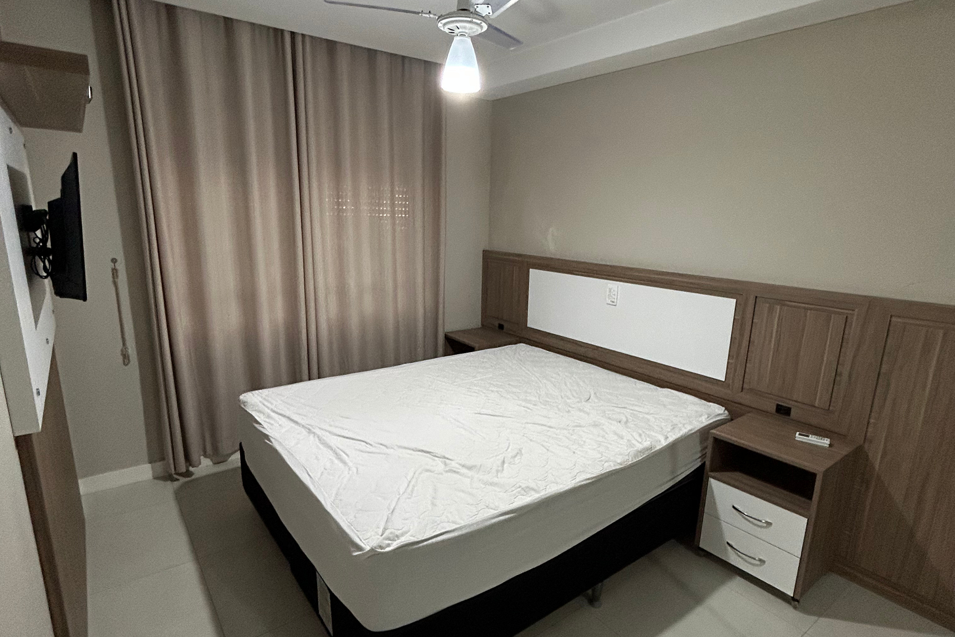 01 Dormitório Suíte com acomodação para 02 pessoas, sendo: 01 cama de casal queen. Roupeiro. Este dormitório está equipado com ar-condicionado split, e ventilador de teto, tv 32".