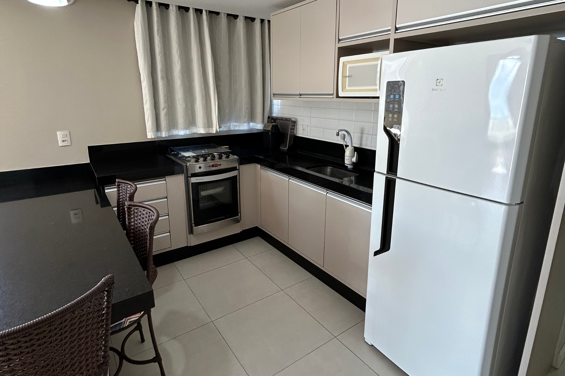 Cozinha equipada com geladeira duplex, microondas, fogão de 04 bocas com forno a gás e utensílios básicos de cozinha.