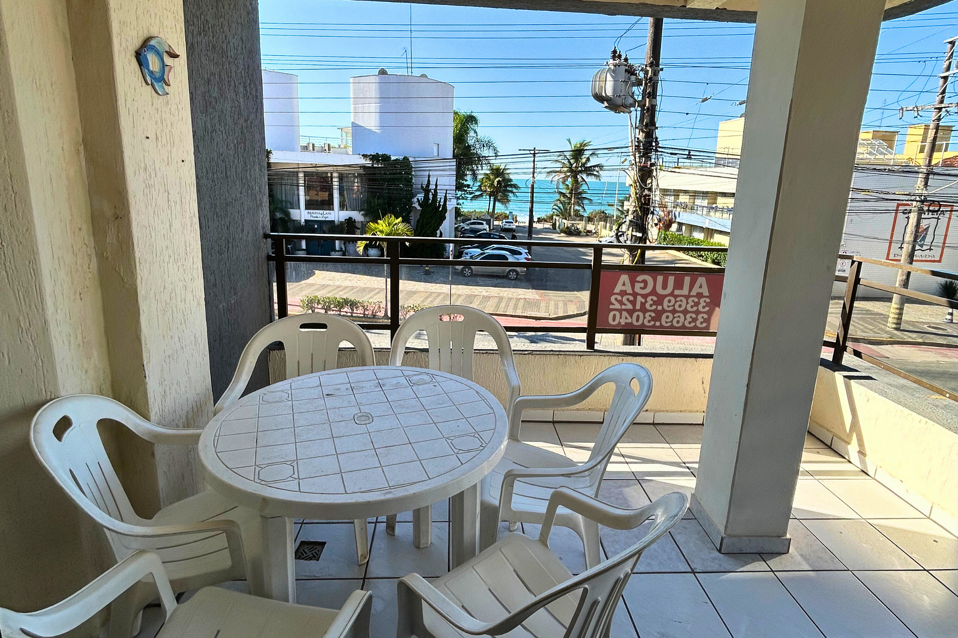 Ampla sacada com churrasqueira, mesa com 04 cadeiras e vista para o mar.