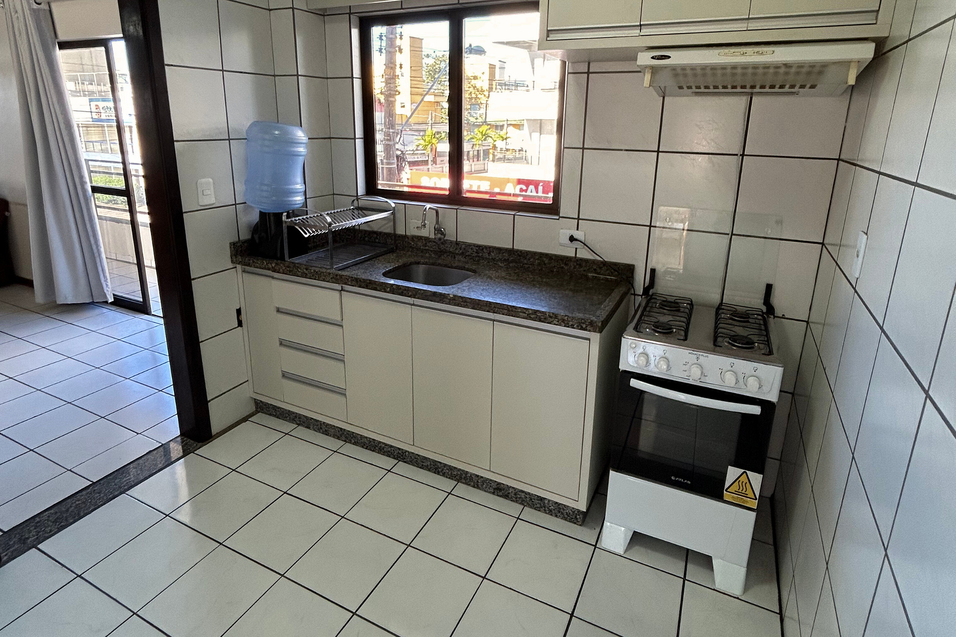Cozinha equipada com geladeira duplex, fogão de 04 bocas com forno a gás, microondas, depurador e utensílios básico de cozinha.