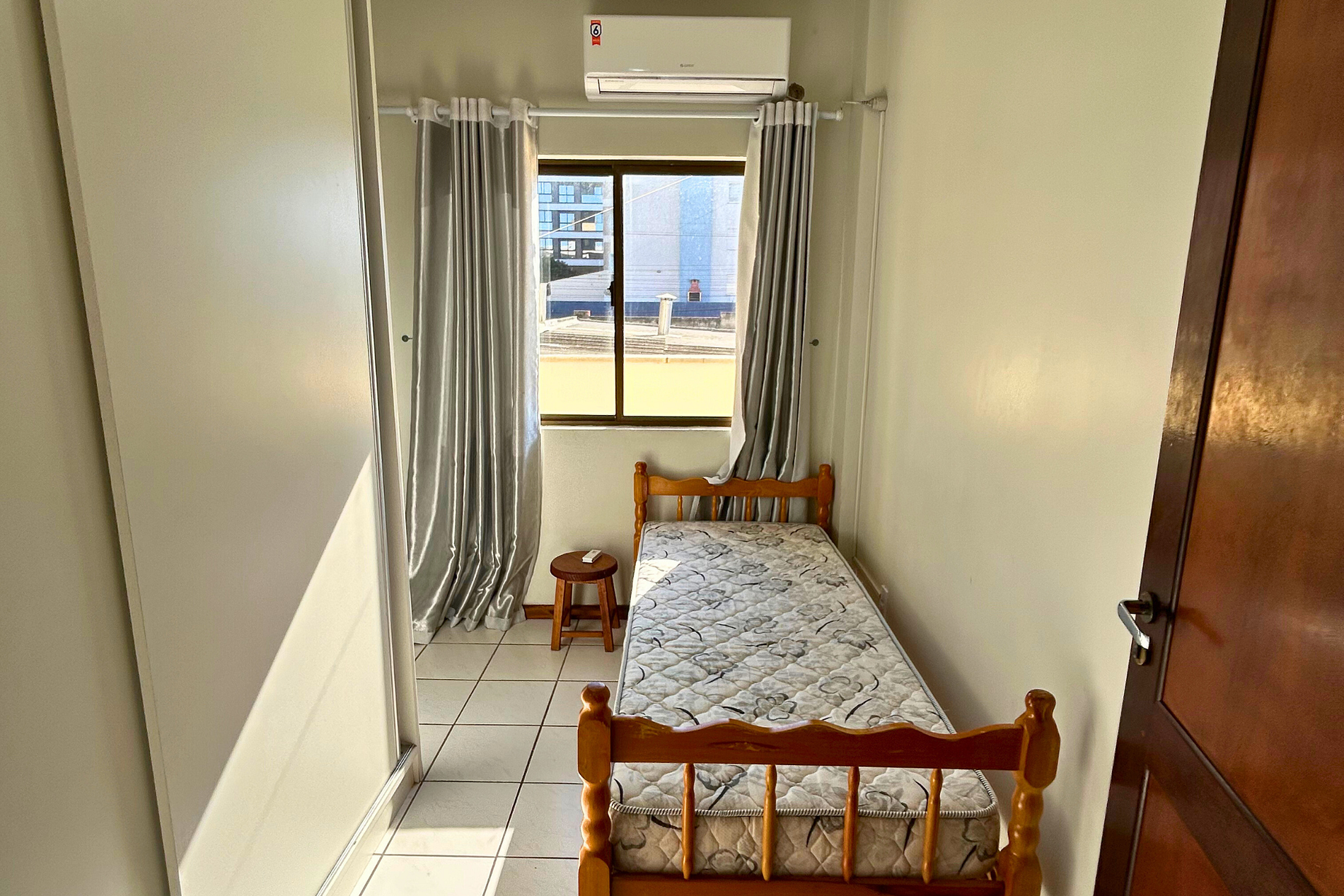 01 Dormitório suíte com acomodação para 01 pessoa, sendo: 01 cama de solteiro com estrutura de madeira com colchão de espuma. Este dormitório está equipado com ventilador de teto e ar-condicionado split.