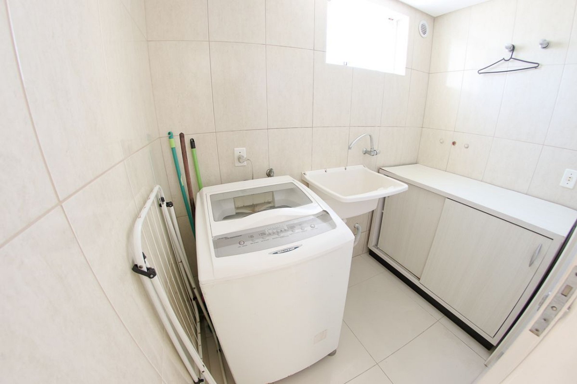 Área de serviço com máquina de lavar roupas e tanque manual.