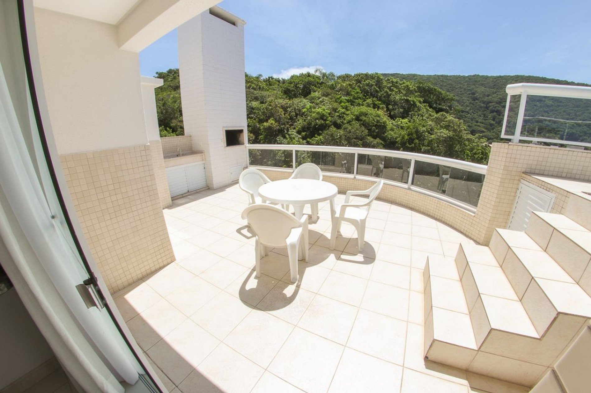 Área com piscina privativa, churrasqueira, pia, mesa com 04 cadeiras e vista para o mar.