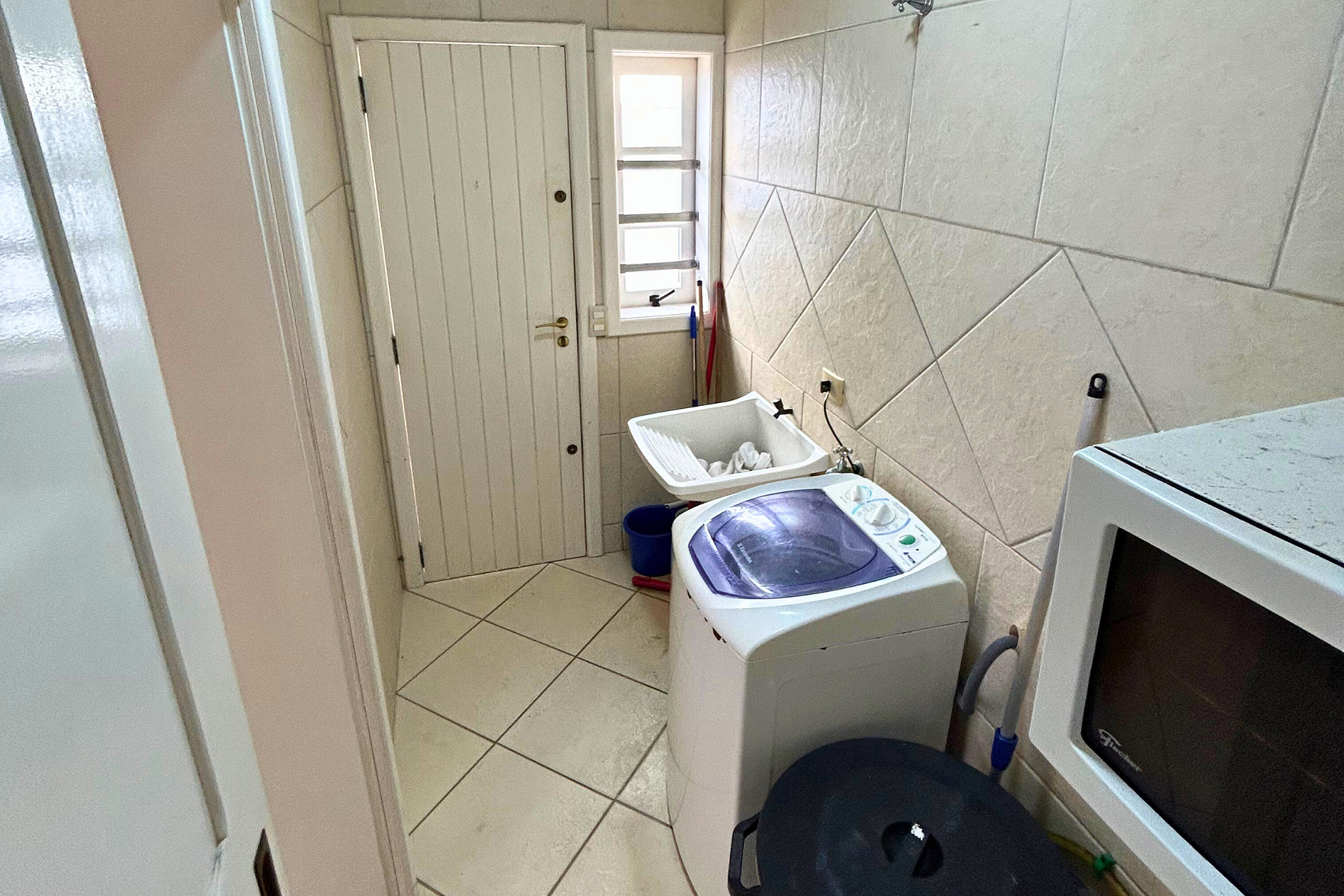 Área de serviço com máquina de lavar roupas e dispensa.