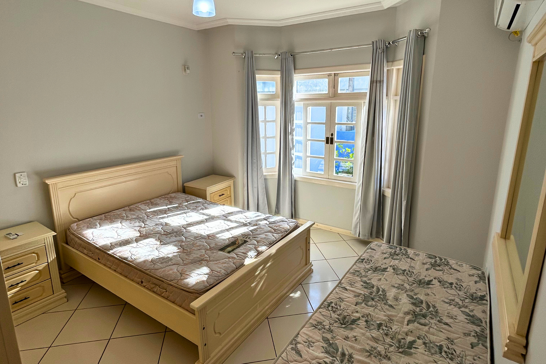 01 Dormitório suíte com acomodação para 03 pessoas, sendo: 01 cama de casal com estrutura de madeira com colchão de espuma e 01 cama box de solteiro. Este dormitório está equipado com ventilador de teto e ar-condicionado split.