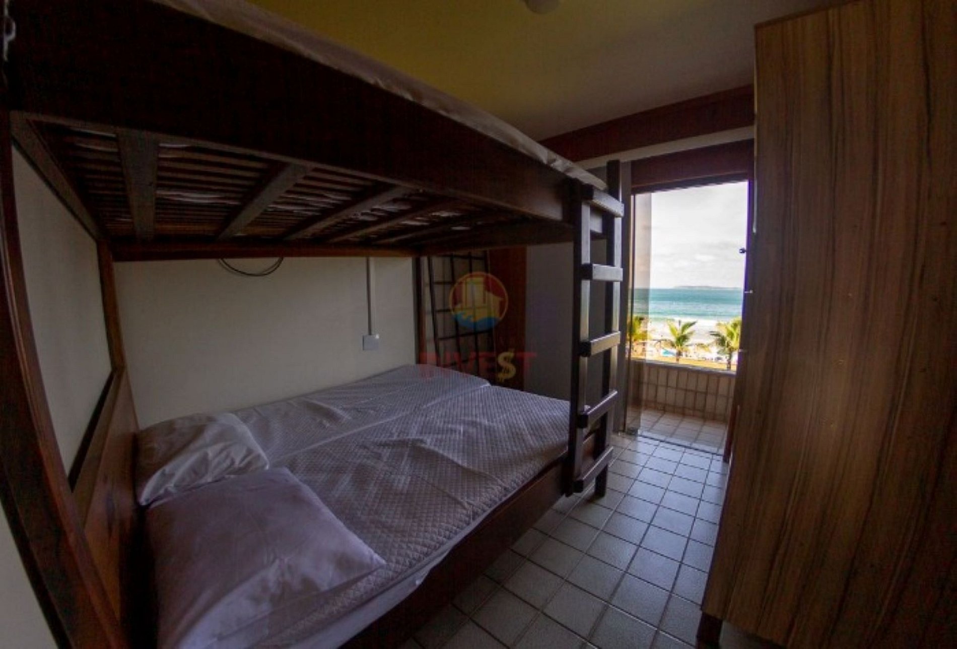 01 Dormitório com acomodação para 02 pessoas, sendo: 01 cama de casal com estrutura de madeira com colchão de espuma. Este dormitório está equipado com ar-condicionado split. Contém vista para o mar.