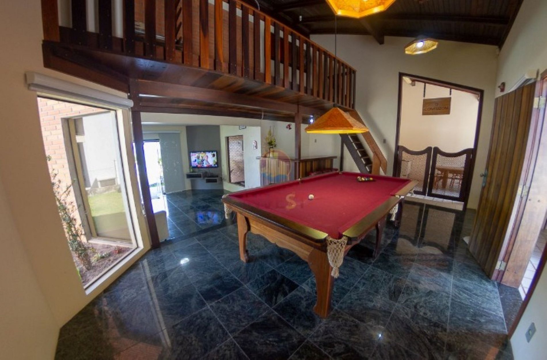 Sala de estar com um sofá de 02 lugares reclinável e retrátil, 01 poltrona, 01 puff, bancada com 06 banquetas, 01 mesa de sinuca e TV com parabólica. Contém acesso para varanda com excelente vista para o mar.