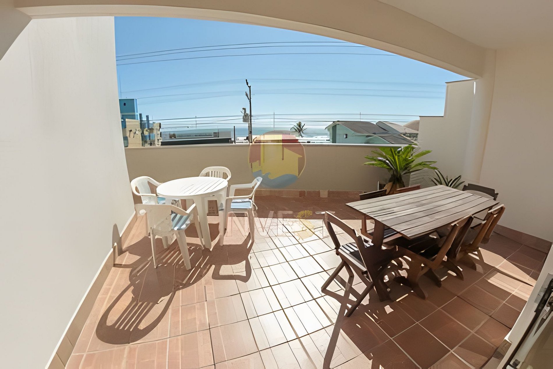 Ampla sacada com mesa e 06 cadeiras, uma mesa de plástico com 04 cadeiras e vista para o mar.