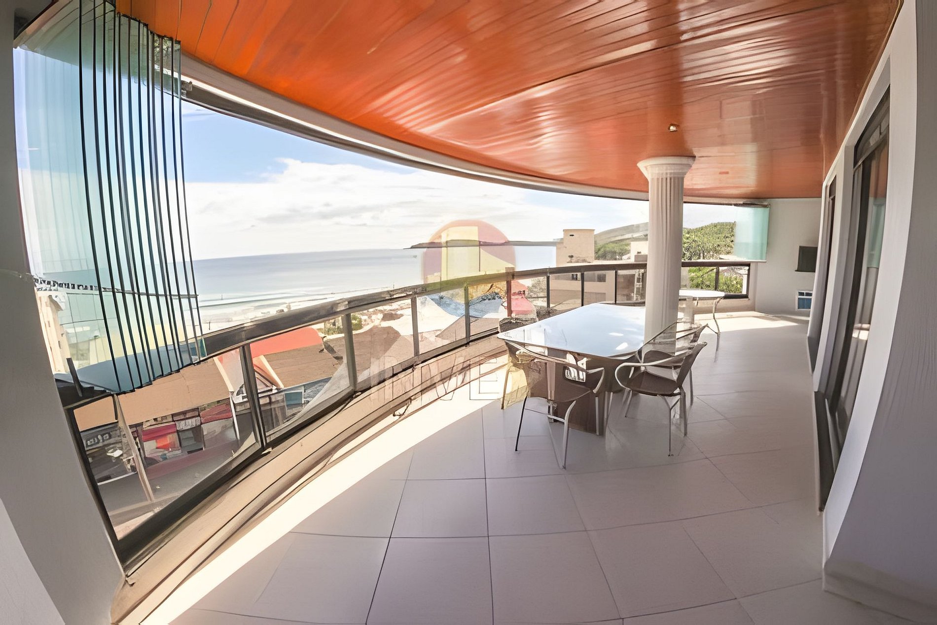 Ampla sacada com churrasqueira, pia, duas mesas com 05 cadeiras e linda vista para o mar.