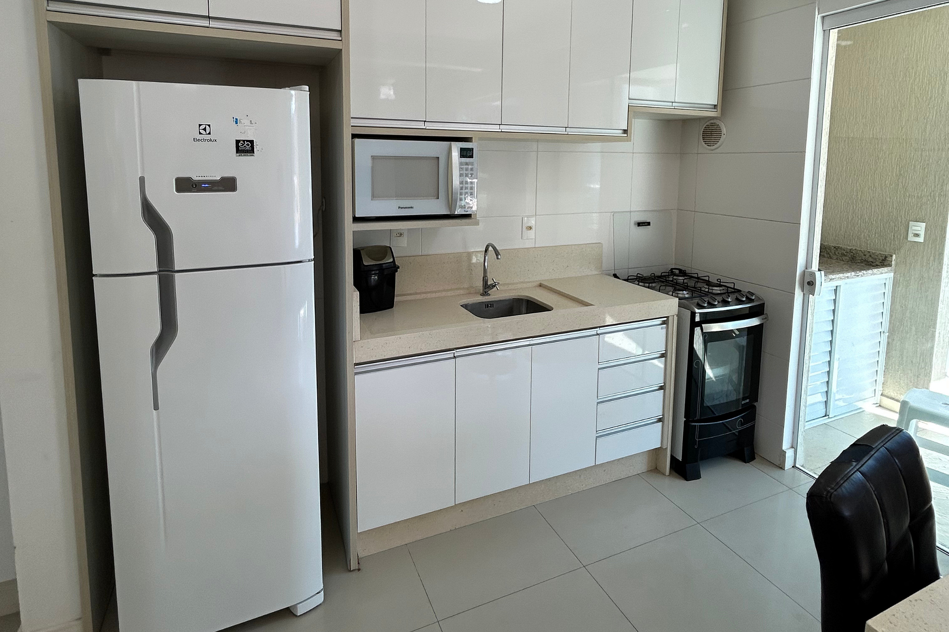 Cozinha equipada com geladeira duplex, fogão de 04 bocas com forno a gás, microondas e utensílios básicos de cozinha. Contém acesso para área externa.