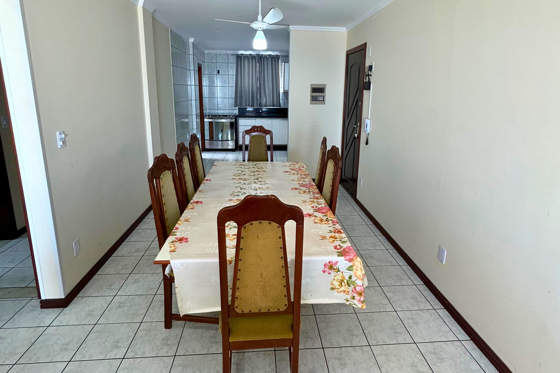 Sala de jantar com ventilador de teto e mesa com 08 cadeiras.