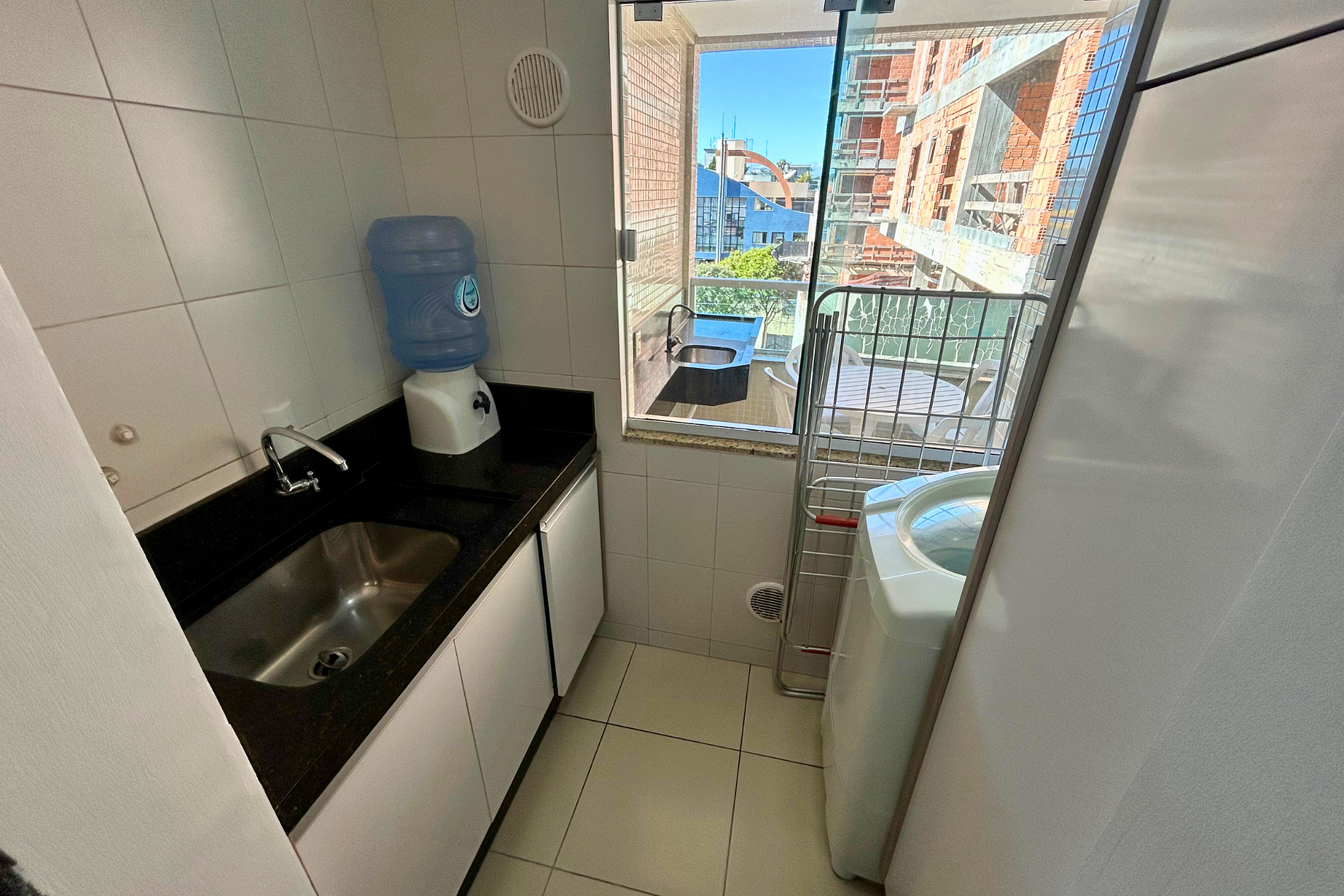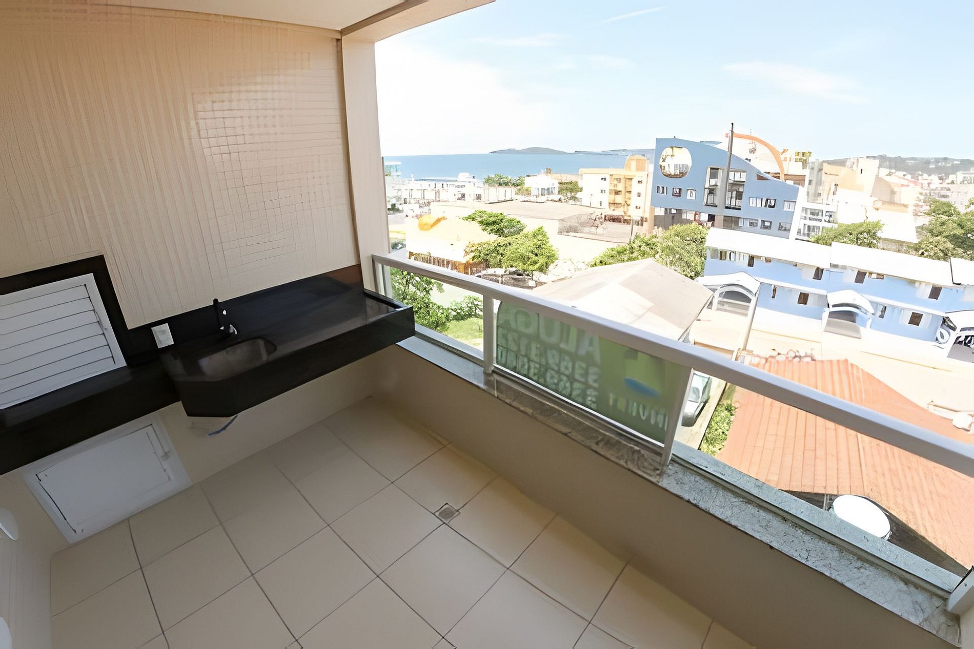 Sacada com churrasqueira, pia e vista para o mar.