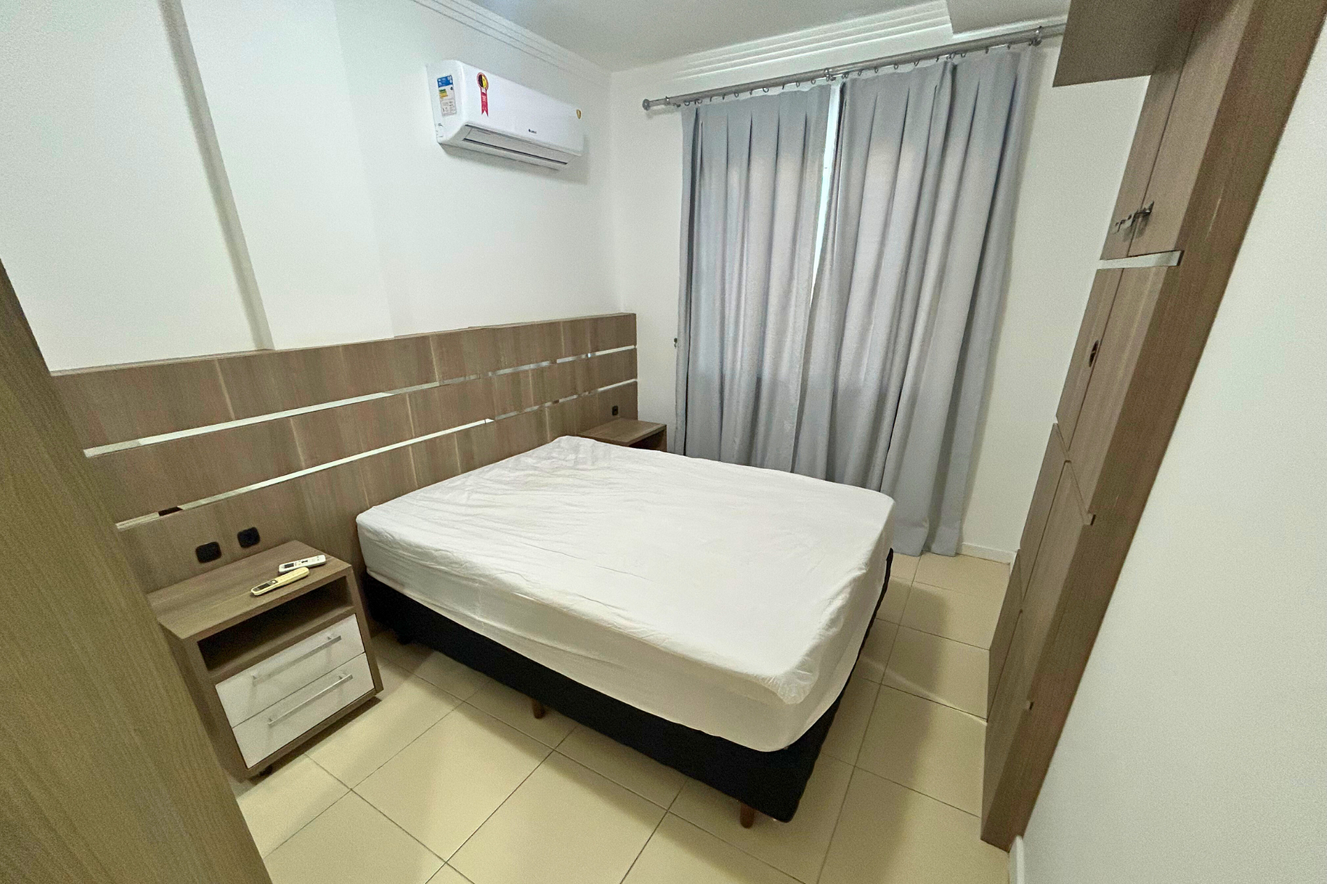 01 Dormitório Suíte com acomodação para 02 pessoas, sendo: 01 cama box de casal. Este apartamento está equipado com ar-condicionado split.