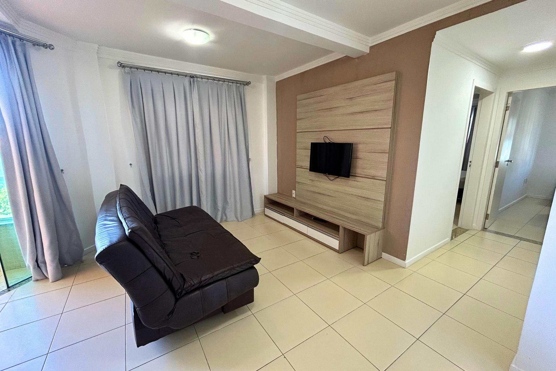 Sala de estar com um sofá-cama e TV com parabólica. Contém acesso para sacada com vista para o mar.
