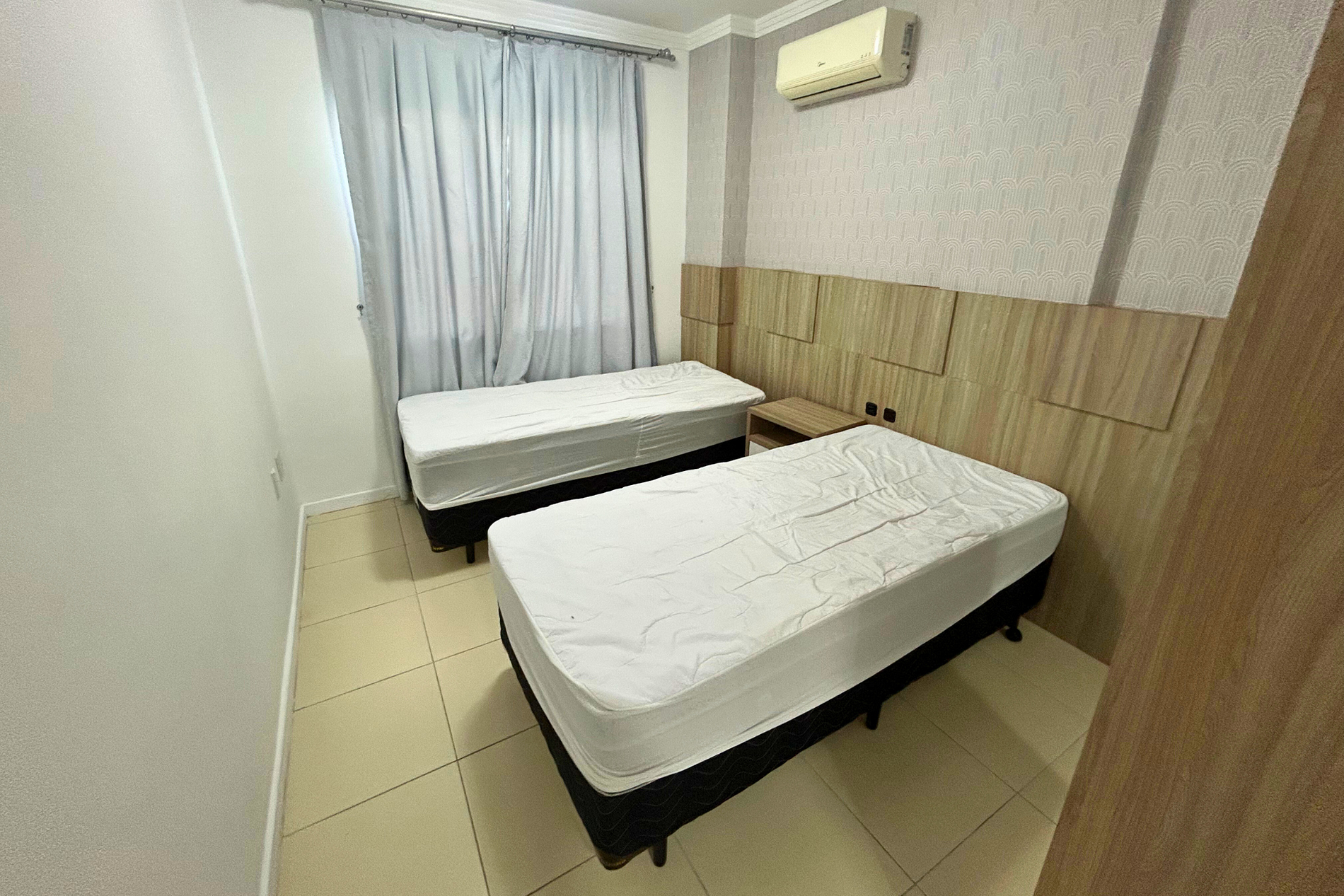 01 Dormitório com acomodação para 02 pessoas, sendo: 02 camas box de solteiro. Este dormitório está equipado com ar-condicionado split.