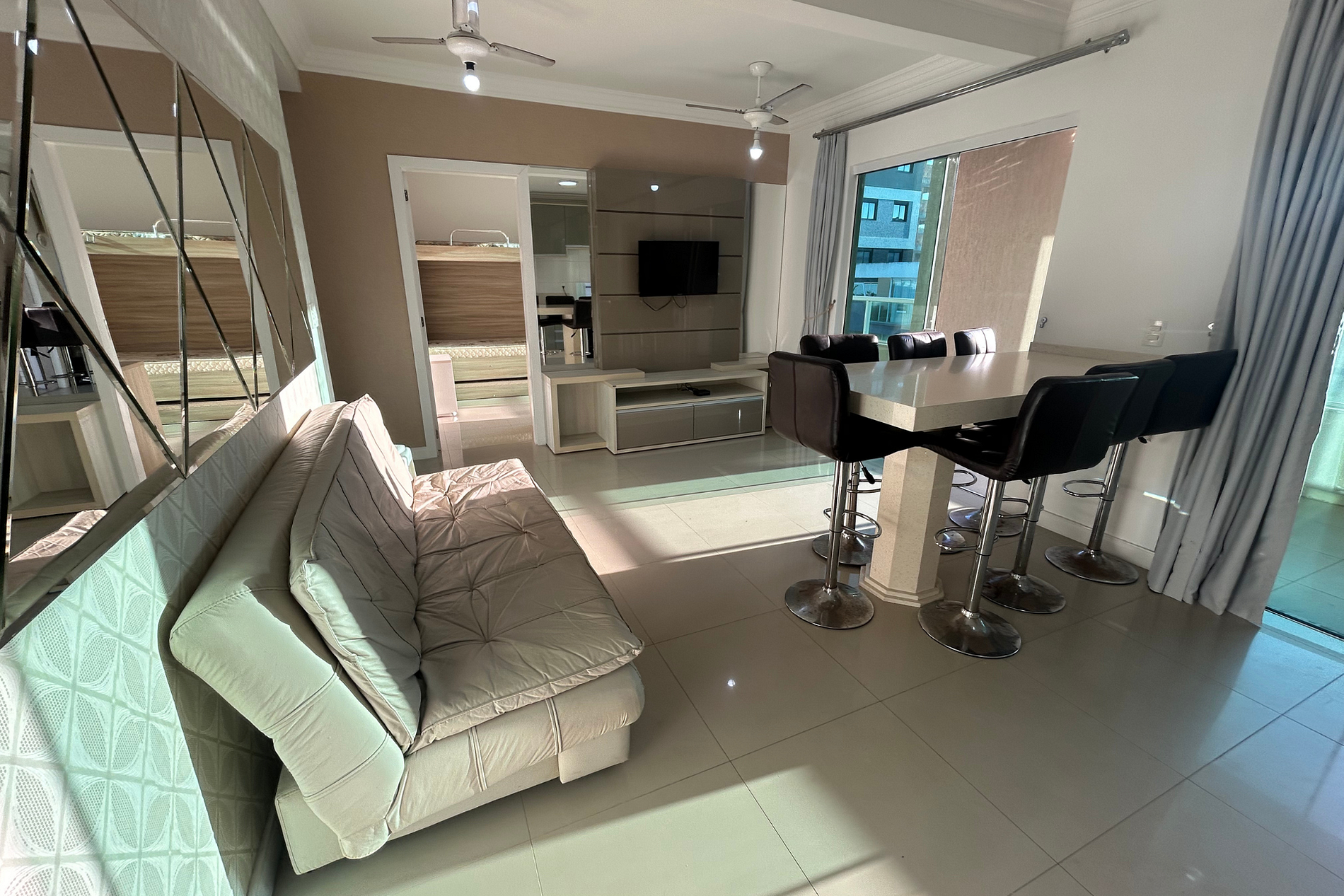 Sala de estar com um sofá-cama, ventilador de teto e TV com parabólica. Contém acesso para área externa.