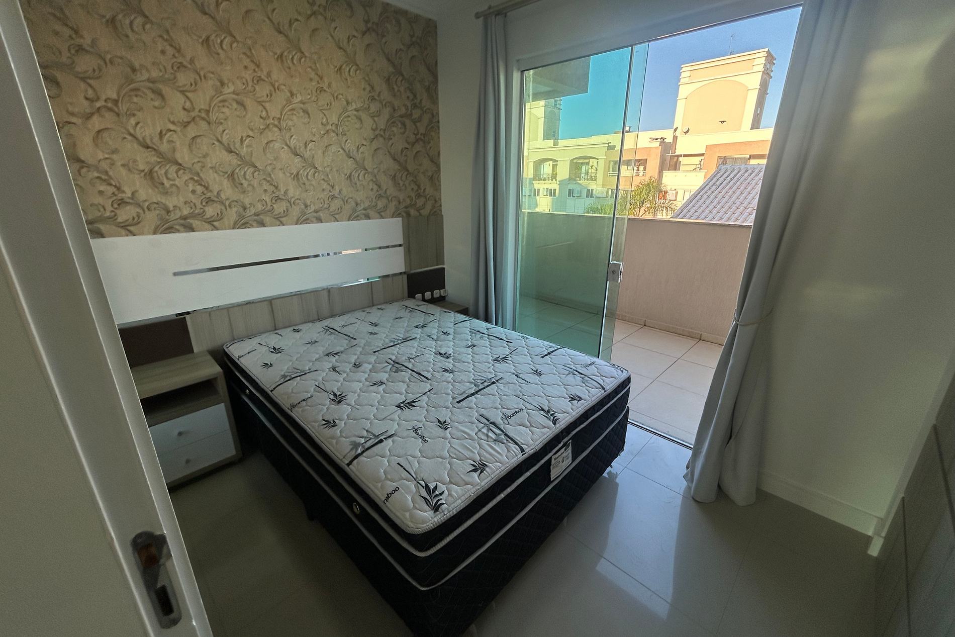 01 Dormitório Suíte com acomodação para 02 pessoas sendo: 01 cama box de casal. Este dormitório está equipado com ar-condicionado split e TV com parabólica. Contém acesso para área externa.