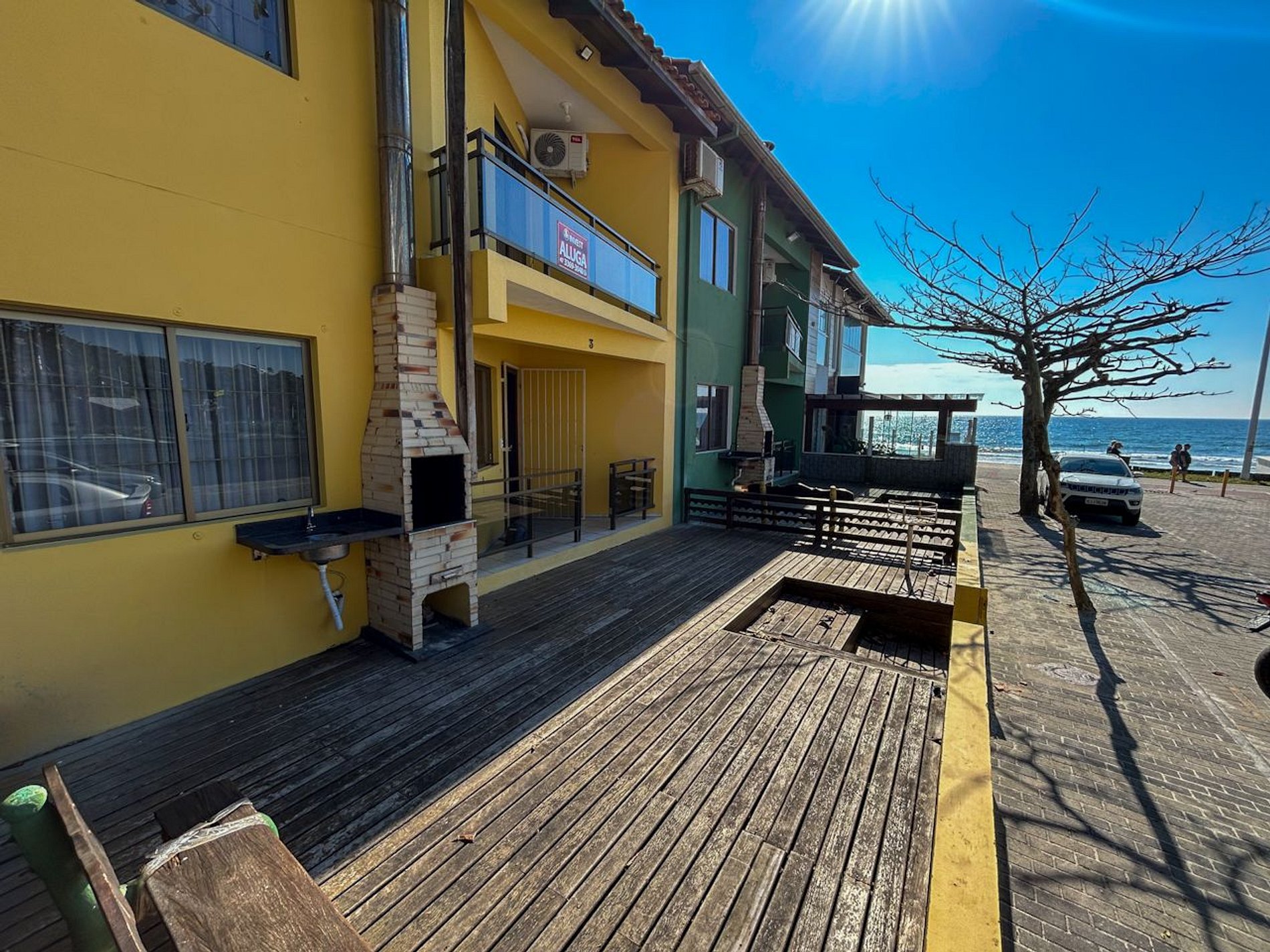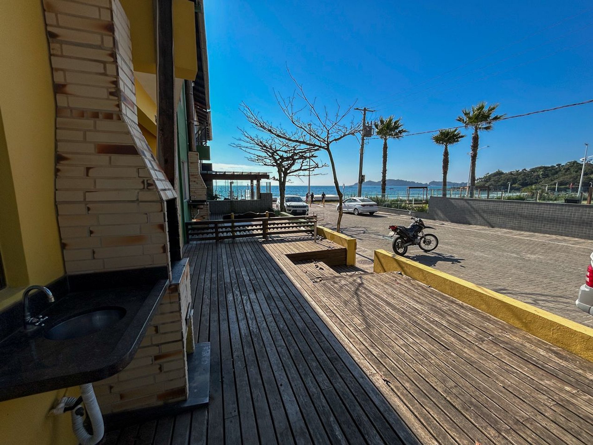 Deck com churrasqueira, pia, banco de 03 lugares e vista para o mar.