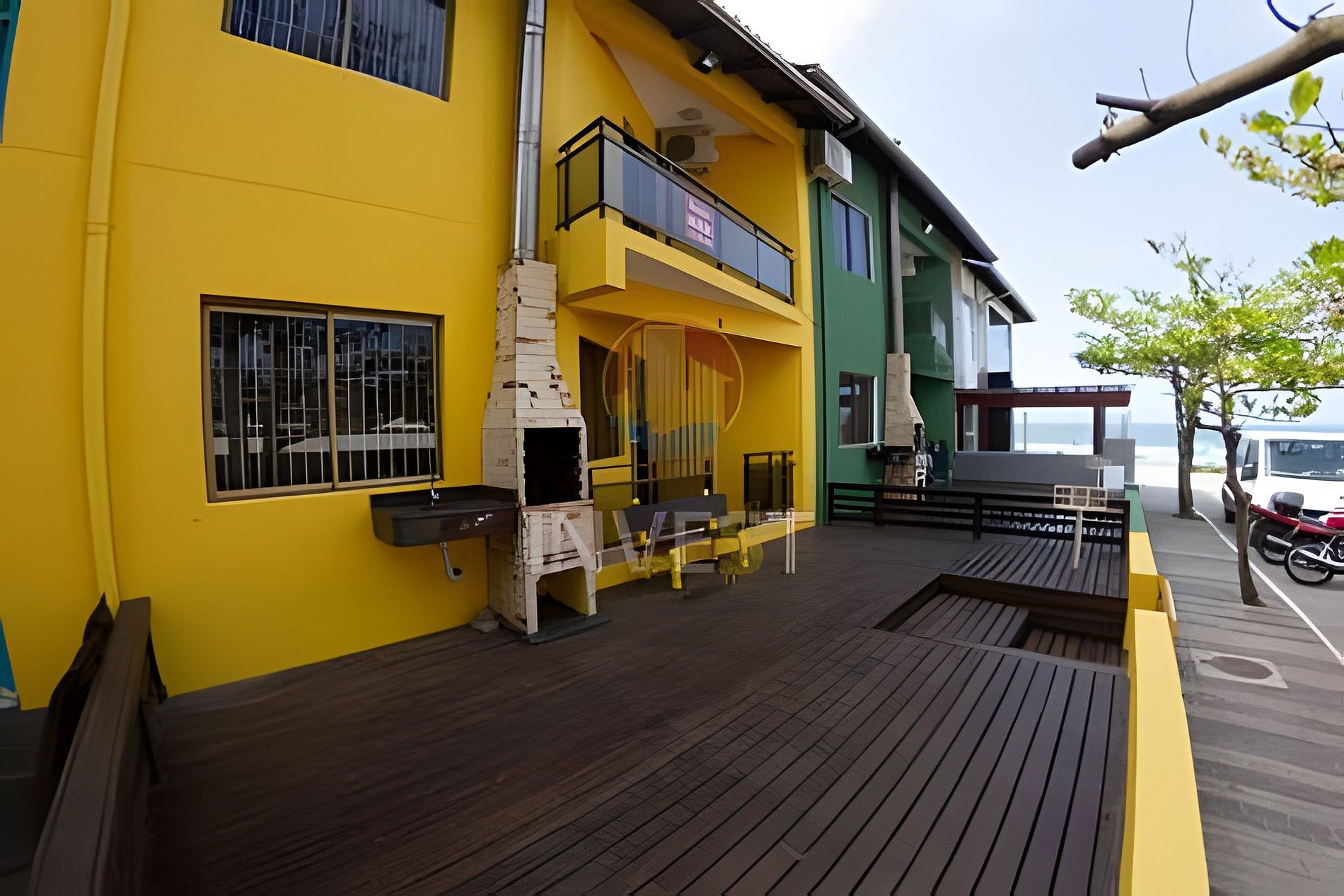 Deck com churrasqueira, pia, banco de 03 lugares e vista para o mar.