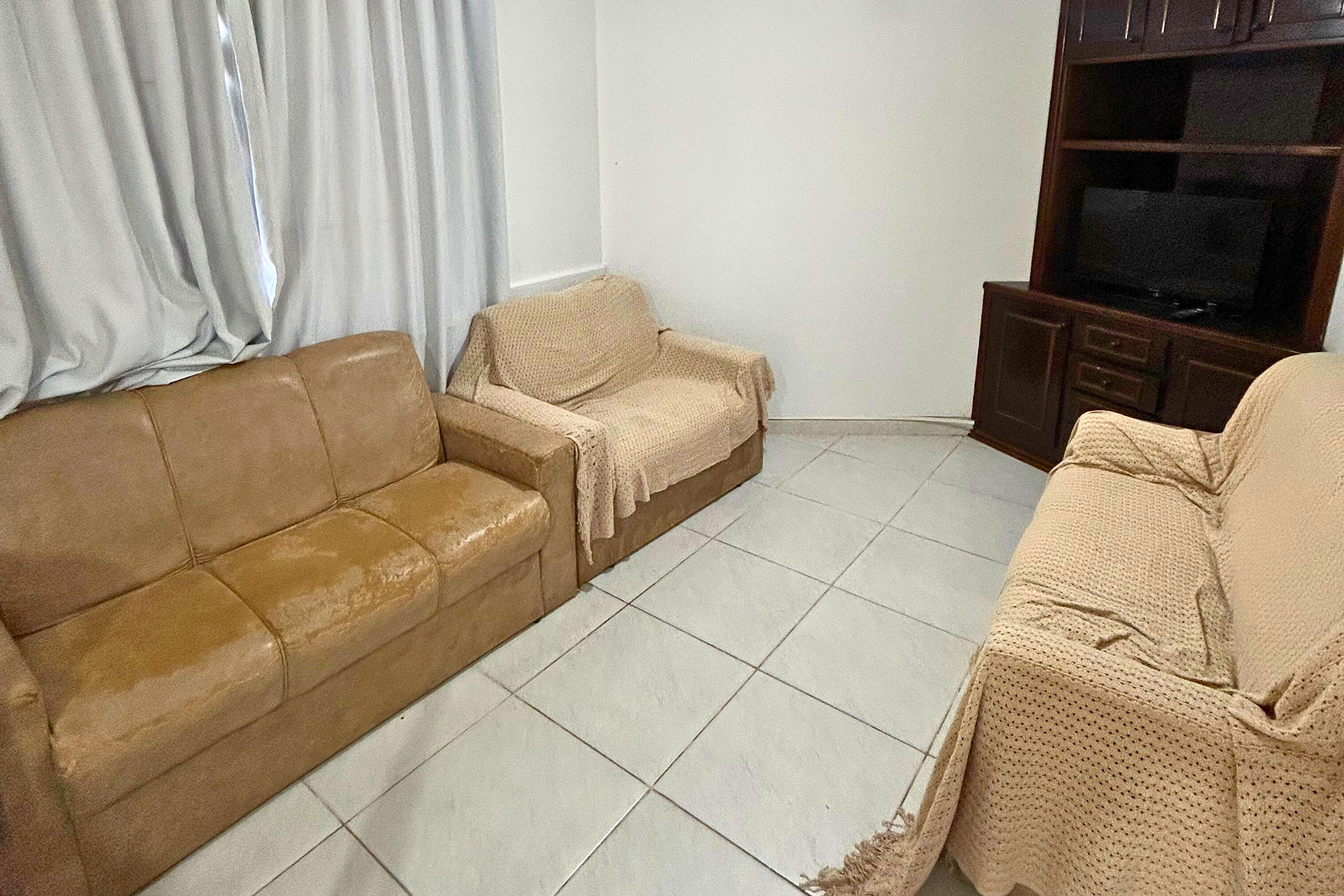 Sala de estar com dois sofás de 03 lugares, um sofá de 02 lugares, ventilador de teto e TV com parabólica.
