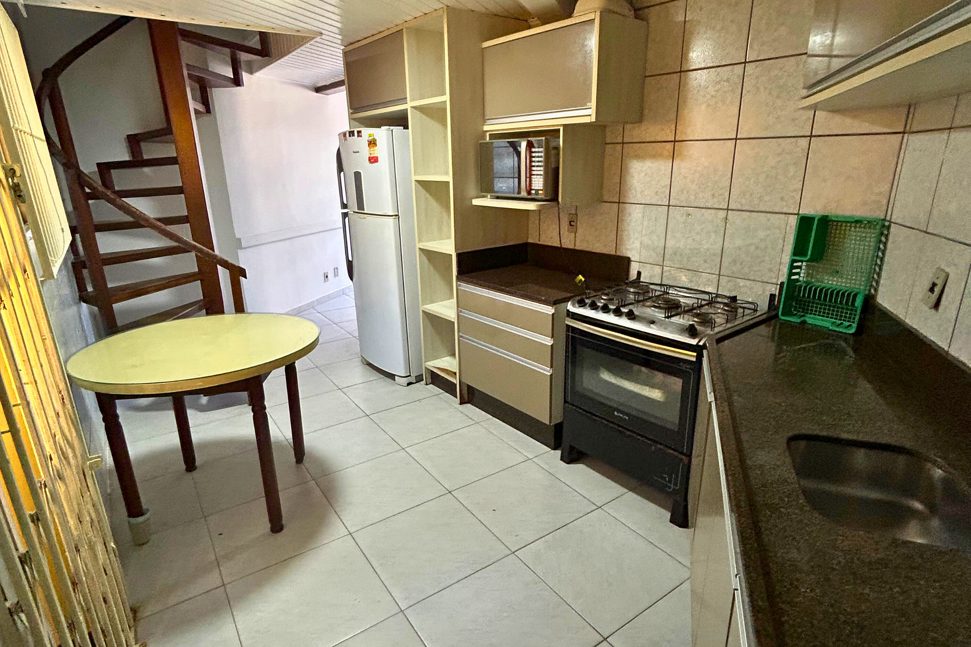 Cozinha equipada com geladeira duplex, microondas, fogão de 06 bocas com forno a gás, mesa com 02 cadeiras e utensílios básicos de cozinha.