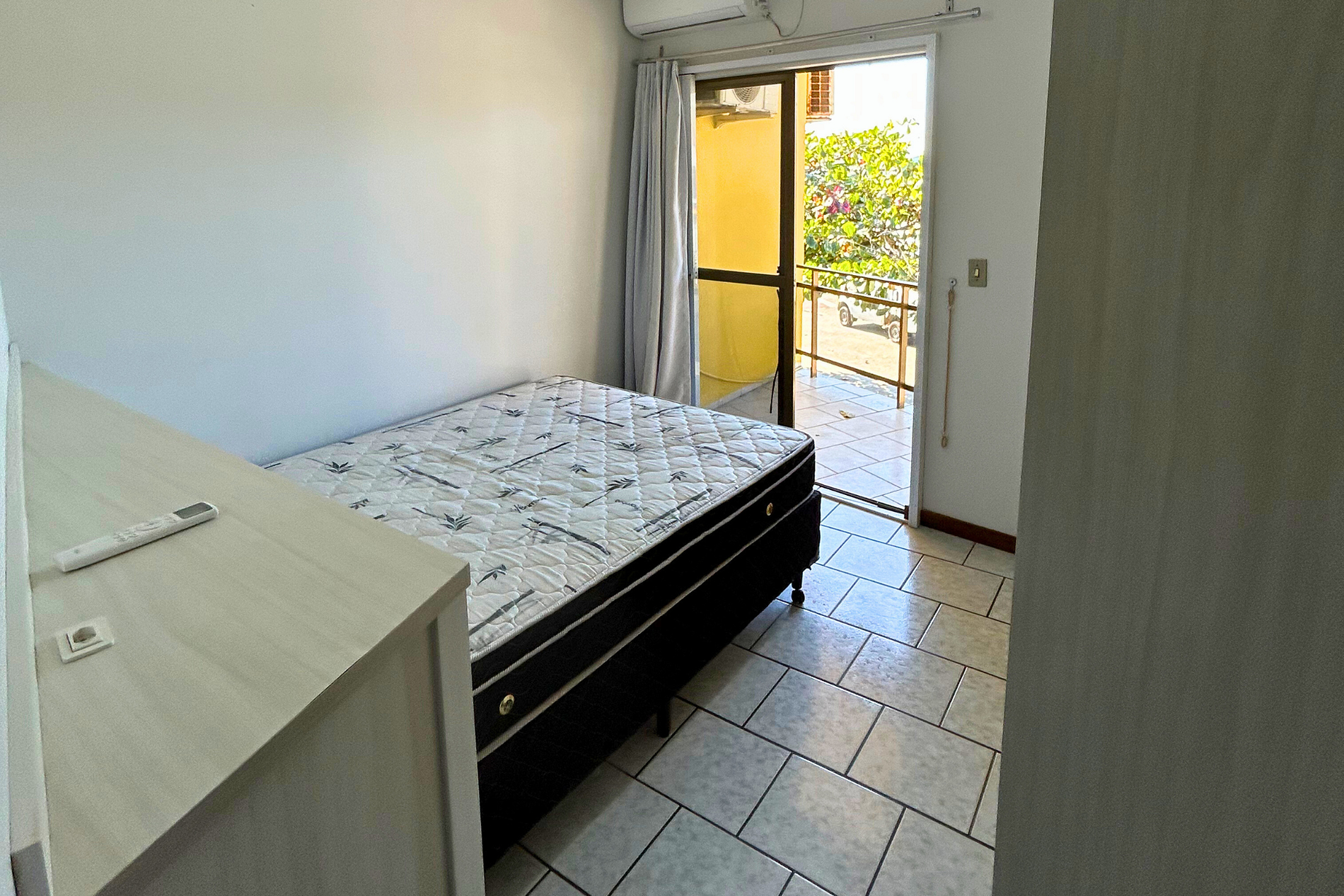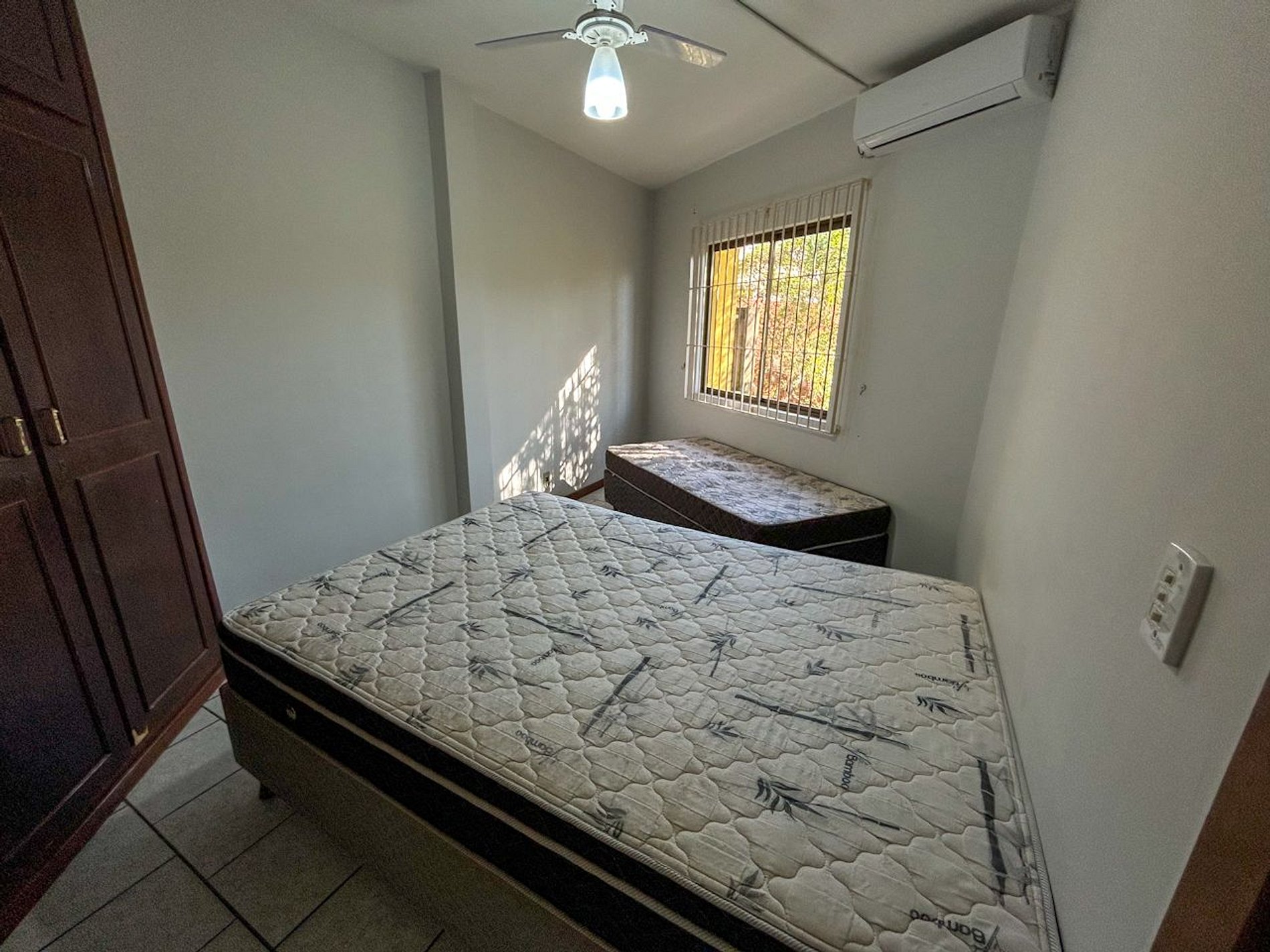 01 Dormitório com acomodação para 03 pessoas, sendo: 01 cama box de casal e 01 cama box de solteiro. Este dormitório está equipado com ar-condicionado split e ventilador de teto.