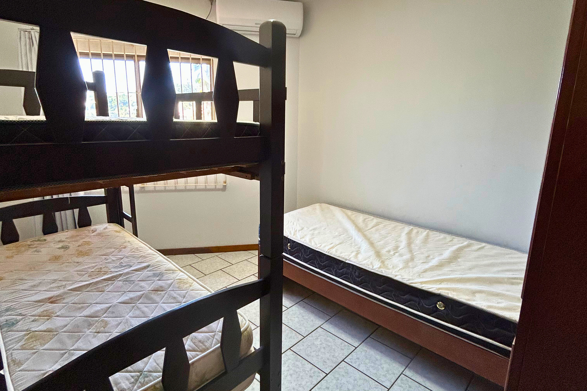 01 Dormitório com acomodação para 03 pessoas, sendo: 01 beliche e 01 cama de solteiro. Este dormitório está equipado com ar-condicionado split e ventilador de teto.