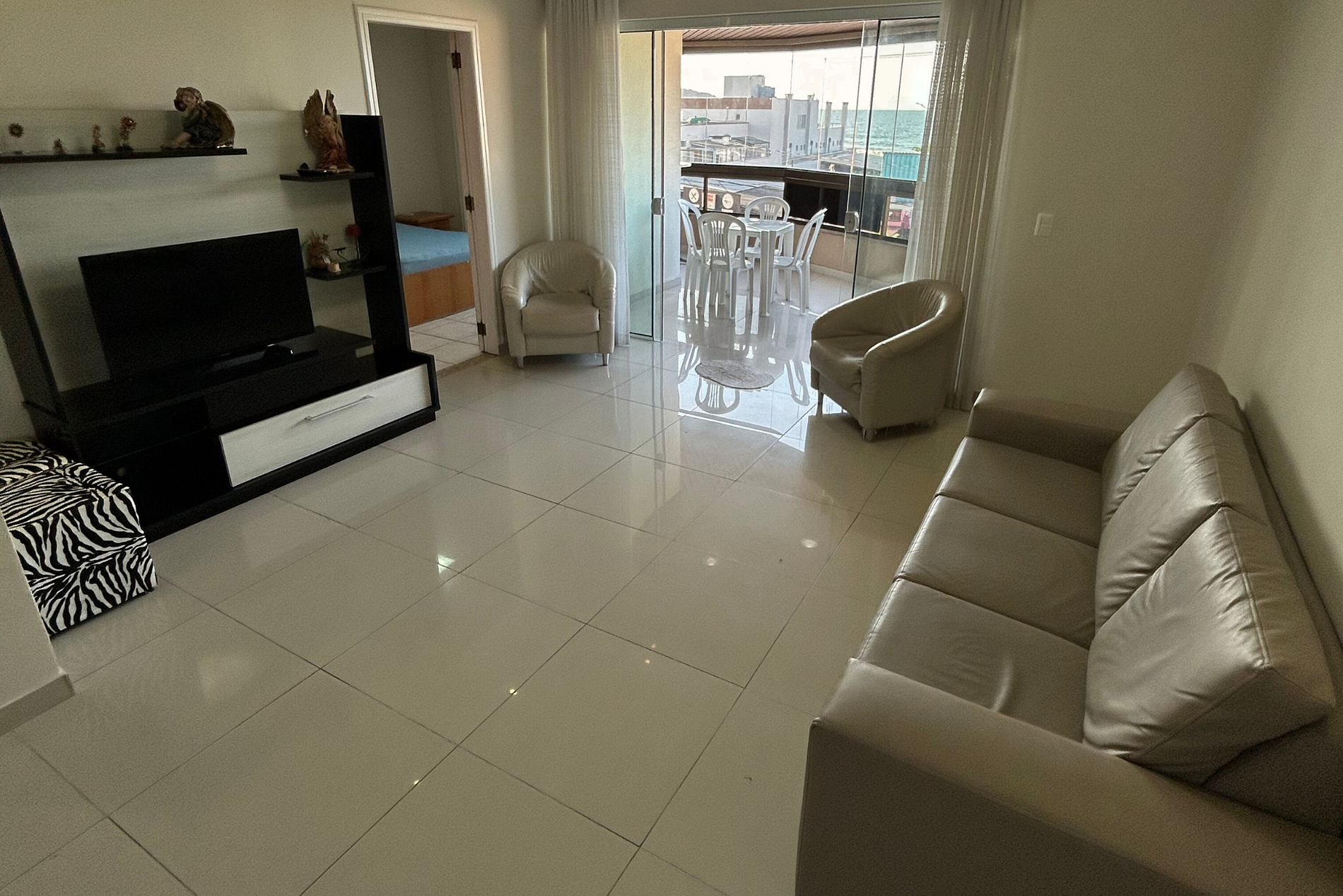 Sala de estar com 01 ventilador de pé, um sofá de 03 lugares, 02 poltronas e TV com parabólica. Contém acesso para sacada comvista para o mar.