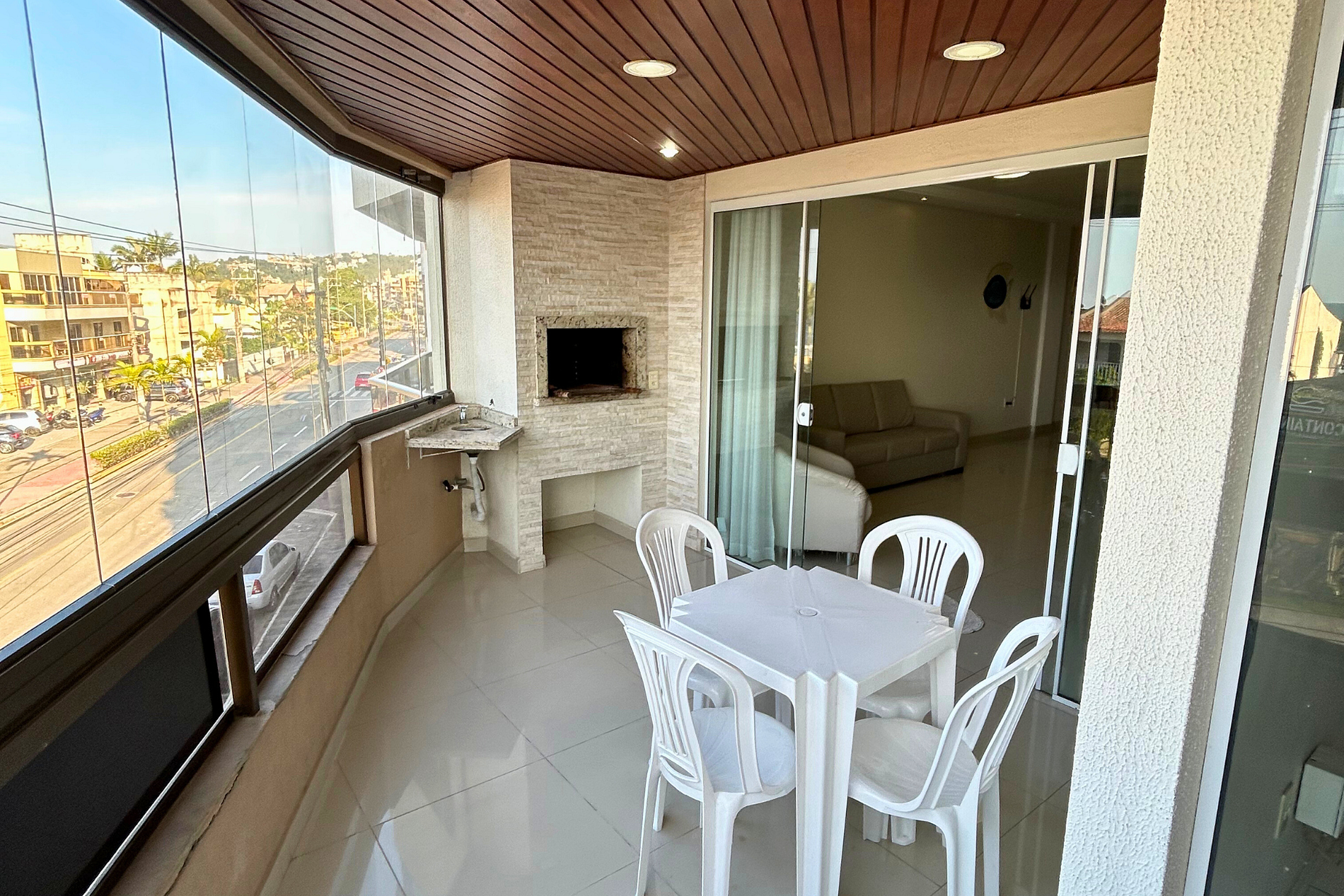 Ampla sacada com churrasqueira, mesa com 04 cadeiras, pia, reiki e vista para o mar.