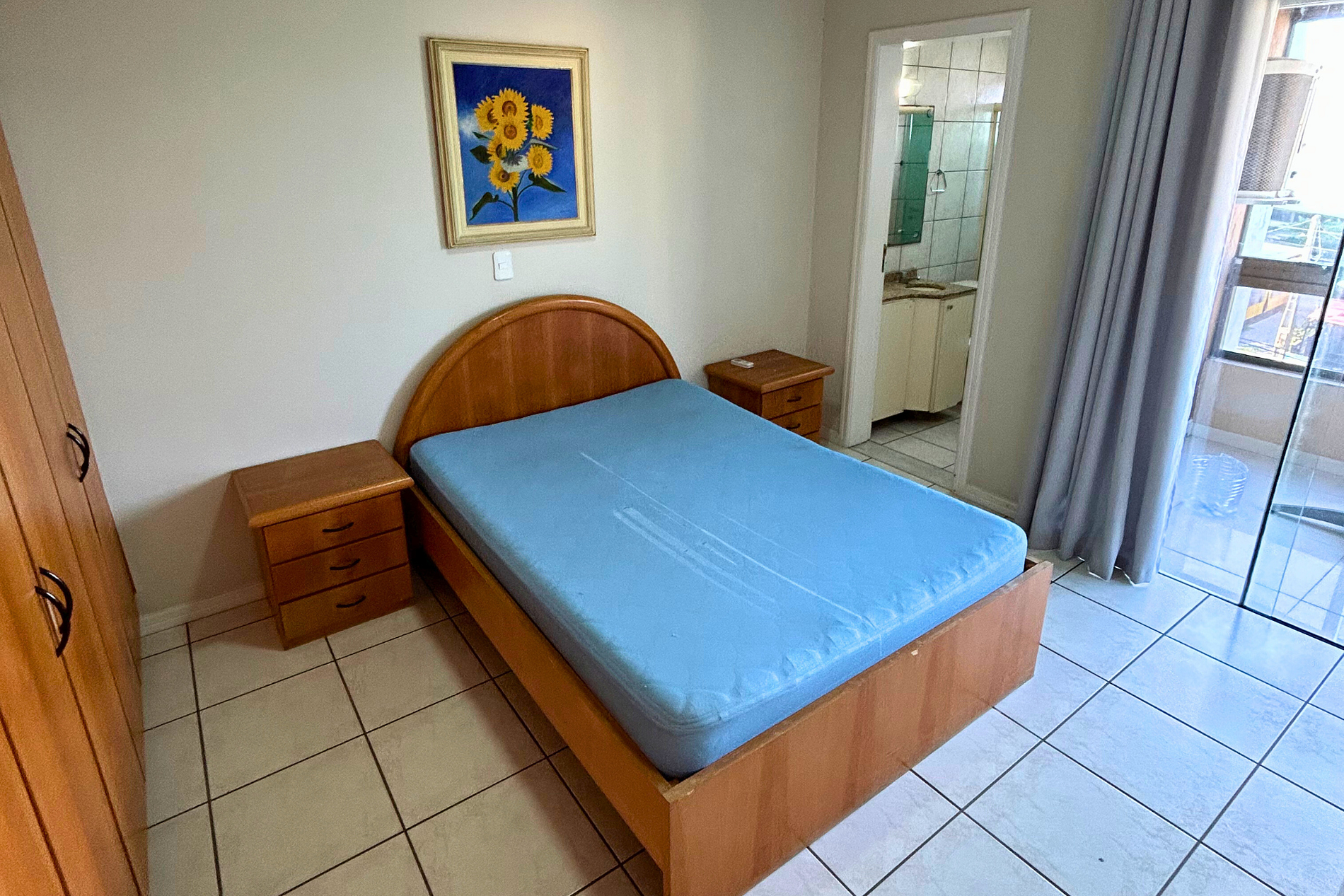 01 Dormitório Suíte com acomodação para 02 pessoas, sendo: 01 cama de casal com estrutura de madeira com colchão de espuma. Este dormitório está equipado com ar-condicionado split. Contém acesso para sacada.