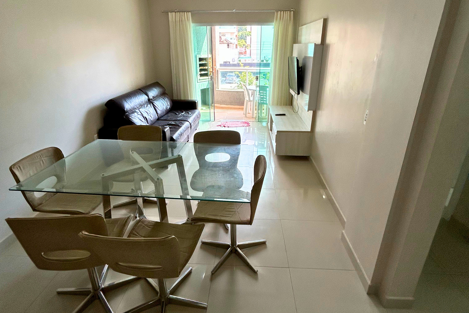 Sala de estar com um sofá retrátil de 04 lugares, TV com parabólica e ventilador de teto. Contém acesso para sacada.