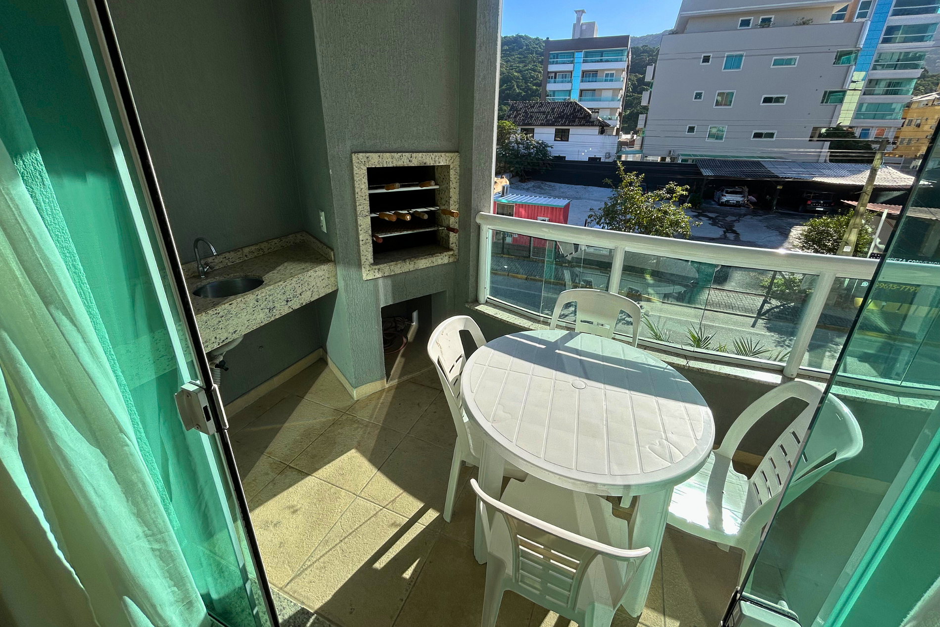 Ampla sacada com churrasqueira e pia.